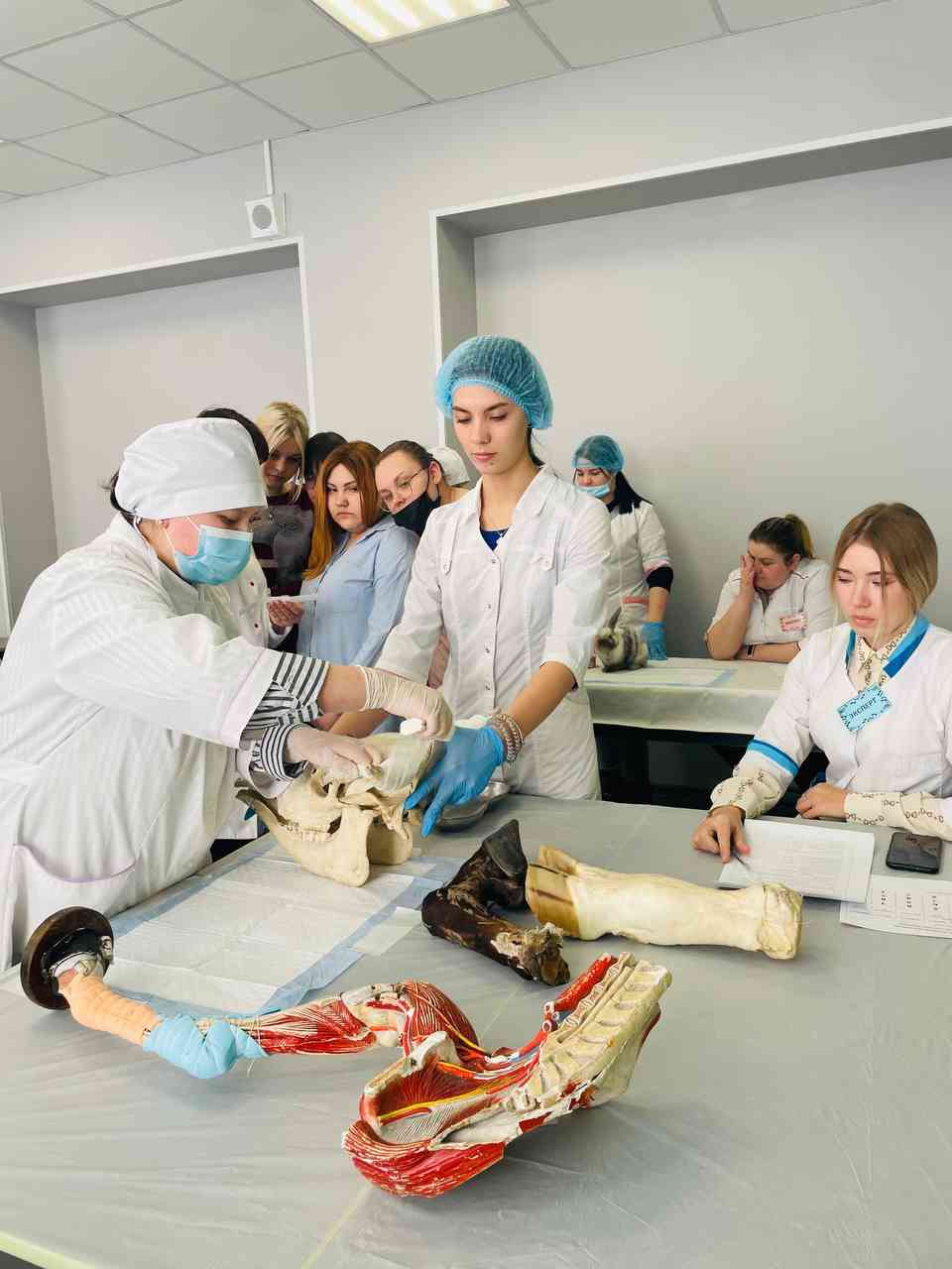 Следующим мероприятием был конкурс профессионального мастерства по специальности ВЕТЕРИНАРИЯ, в котором приняли участие 8 студентов отделения. Им предстояло выполнить 4 профессиональных задания: клинический осмотр птицы и кролика, наложение повязок на разные участки тела и наложение швов на раны. Конкурсные задания в качестве экспертов оценивали преподаватели отделения, работодатели, а также студенты 4 курса - победители профессиональных конкурсов и олимпиад по специальности.