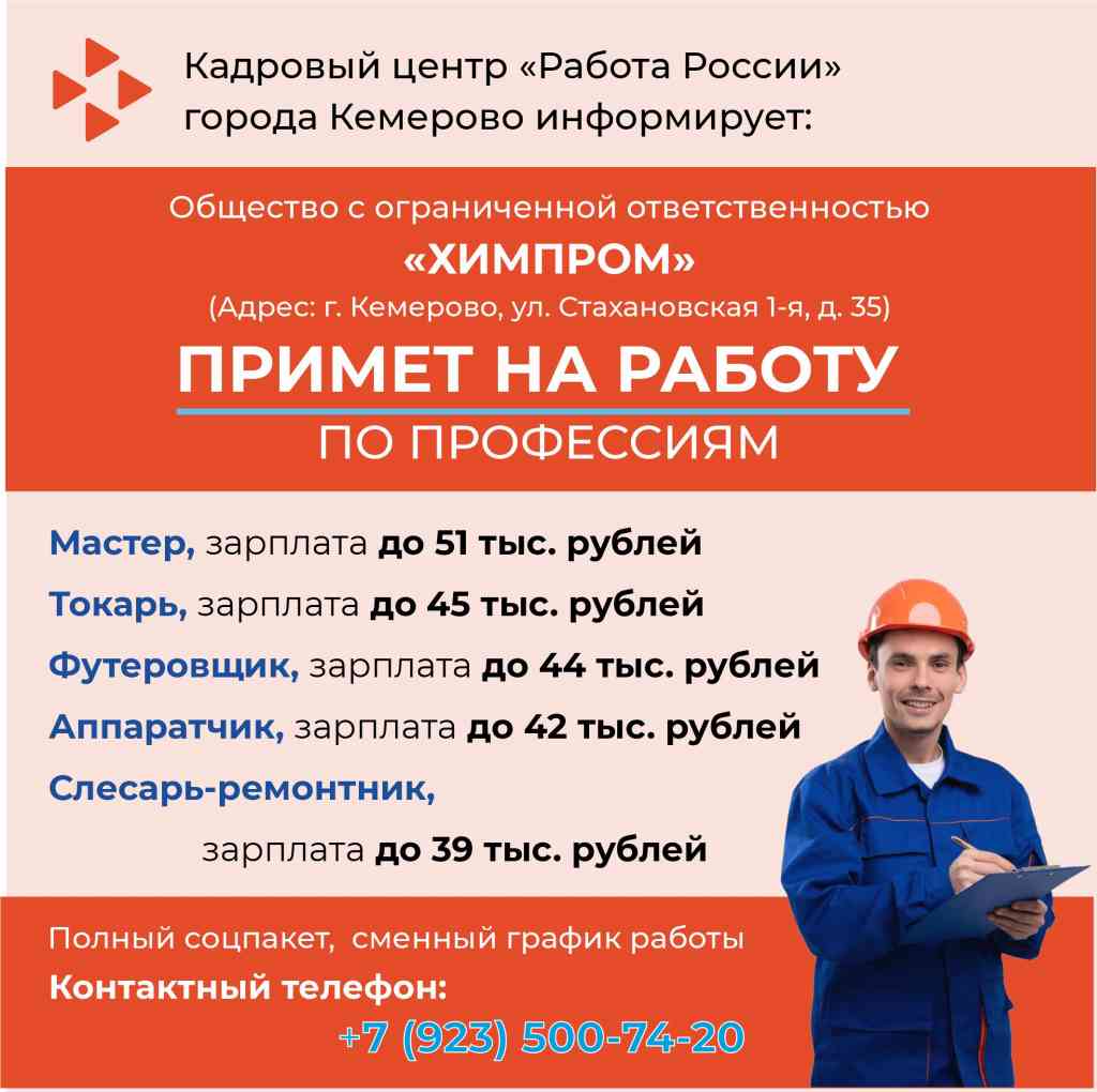 Организация: ООО "Химпром"Вакансия: Слесарь-ремонтникТребования к соискателю: 8(923)500-74-20Условия труда: Полный соцпакет, сменный график работыЗаработная плата: 39000РублейАдрес: г. Кемерово, ул. Стахановская 1-я, д.35Контактный телефон: 8 (923) 500 - 74 - 20Брошура: